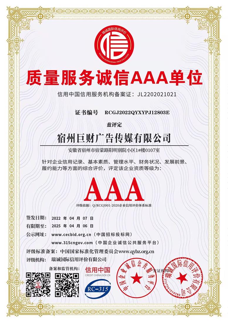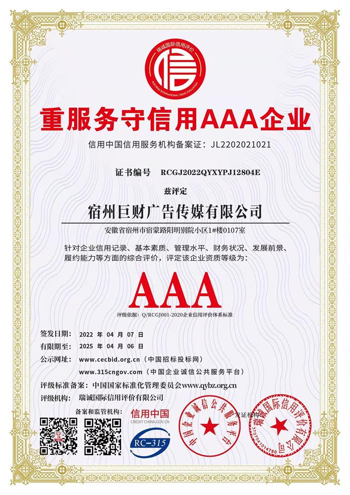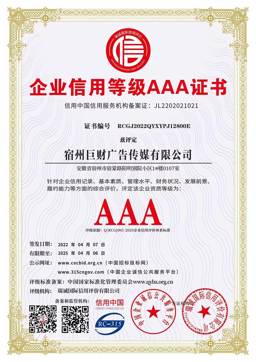 熱(rè)烈祝賀巨财廣告獲企業(yè)信用(yòng)評價AAA級信用(yòng)企Ωβ≥✔業(yè)