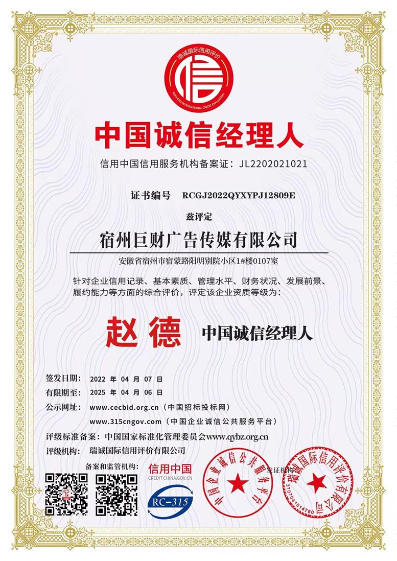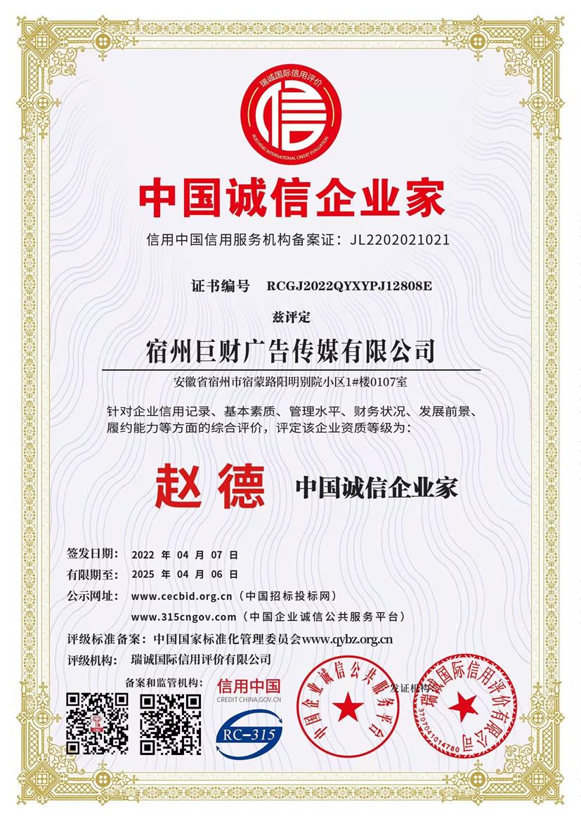熱(rè)烈祝賀巨财廣告獲企業(yè)信用(y≈♦òng)評價AAA級信用(yòng)企業(yè)